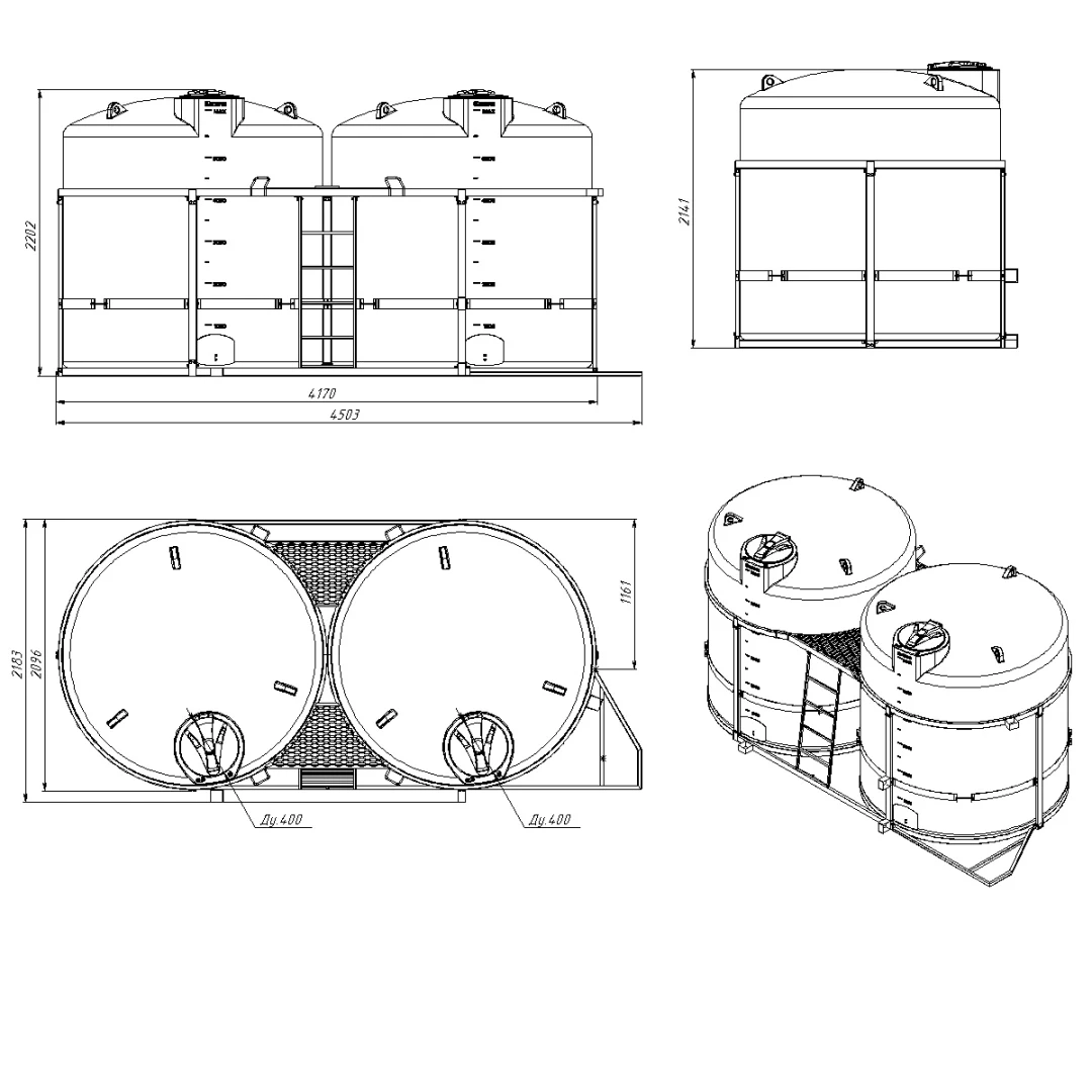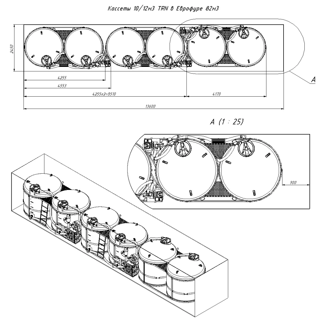 Емкости кассет оснащены градуированной мерной шкалой, оборудованы откидной крышкой с поплавковым дыхательным клапаном и имеют смещенную от центра широкую горловину. Верхние технологические площадки обрешетки и наклонная лестница обеспечивают безопасный доступ к крышкам. Для проведения погрузо-разгрузочных работ на обрешетках кассет предусмотрены проушины.