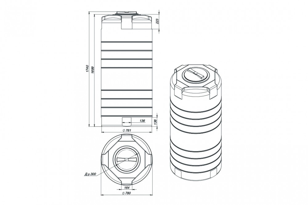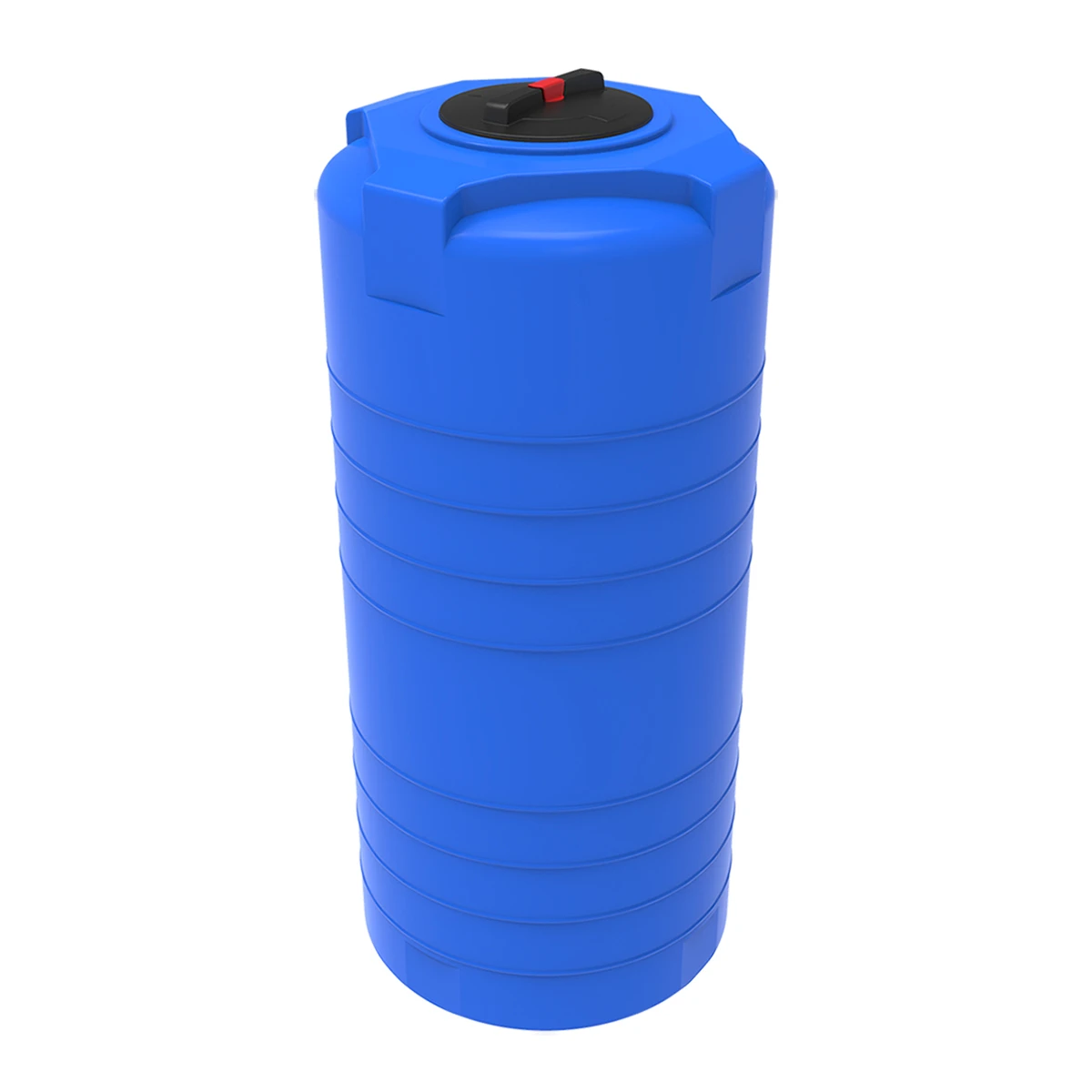 Вертикальная цилиндрическая бочка объемом 750 литров имеет максимально устойчивую конструкцию и усилена специальными горизонтальными ребрами жесткости.