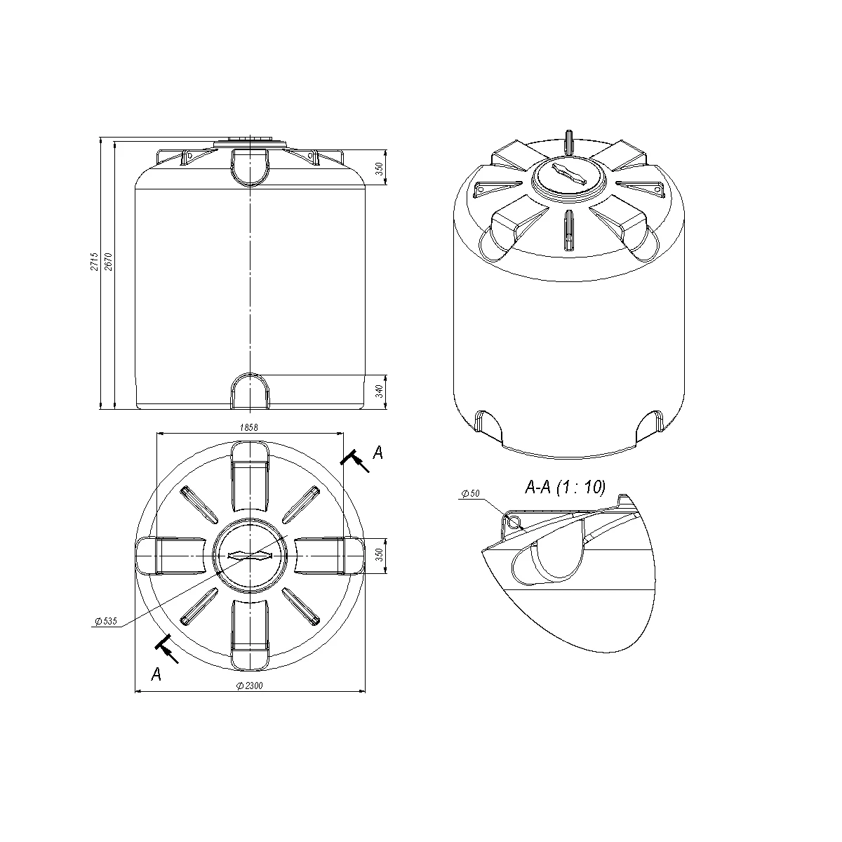 Диаметр горловины емкости составляет 535 мм, диаметр крышки 620мм.