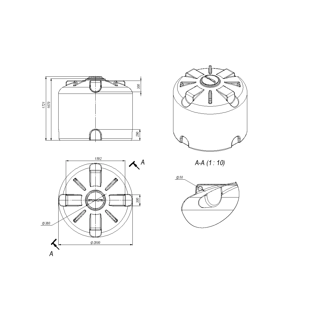 Диаметр горловины емкости составляет 380 мм, диаметр крышки 450мм.