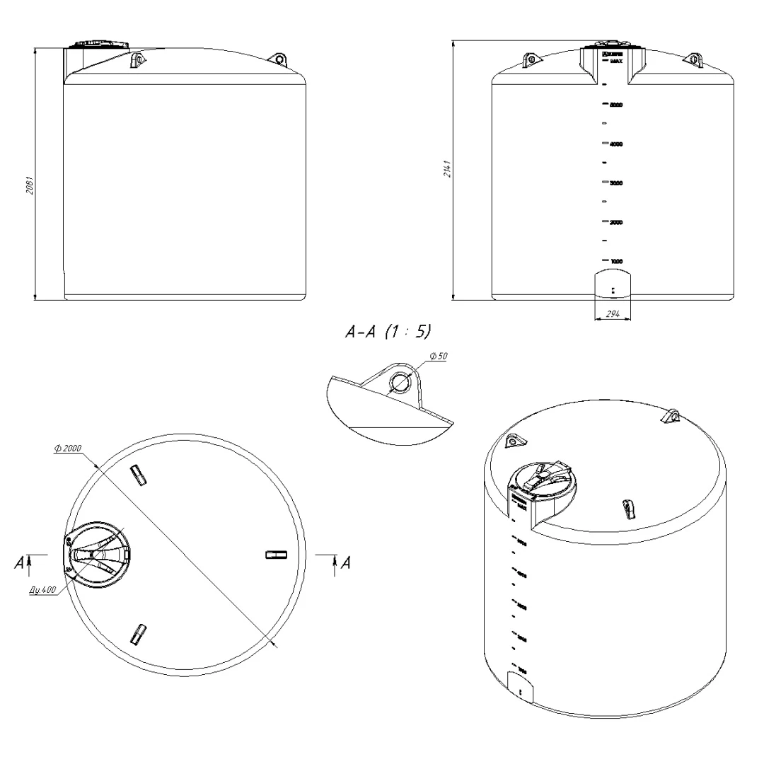 Имеет смещенную относительно центра горловину, для облегчения доступа к крышке емкости. Оборудована откидной крышкой, которая обеспечивает максимальное удобство в эксплуатации. Диаметр горловины емкости составляет 400 мм, диаметр откидной крышки 457 мм.