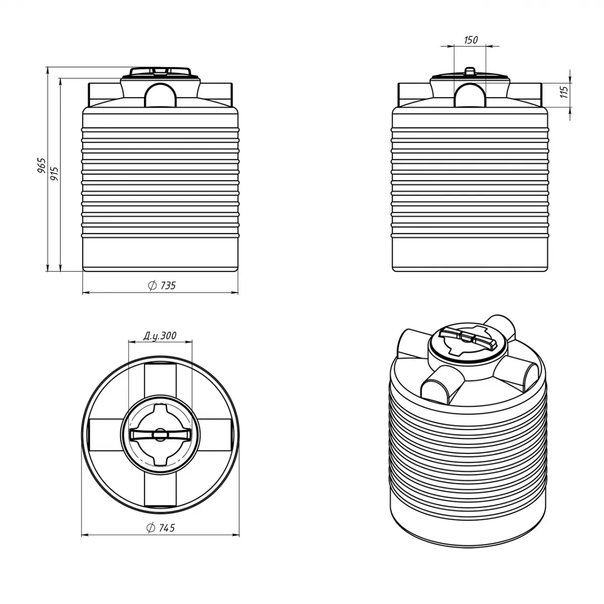 Вертикальная цилиндрическая бочка ЭВЛ 300л имеет максимально устойчивую конструкцию и усилена специальными горизонтальными ребрами жесткости.